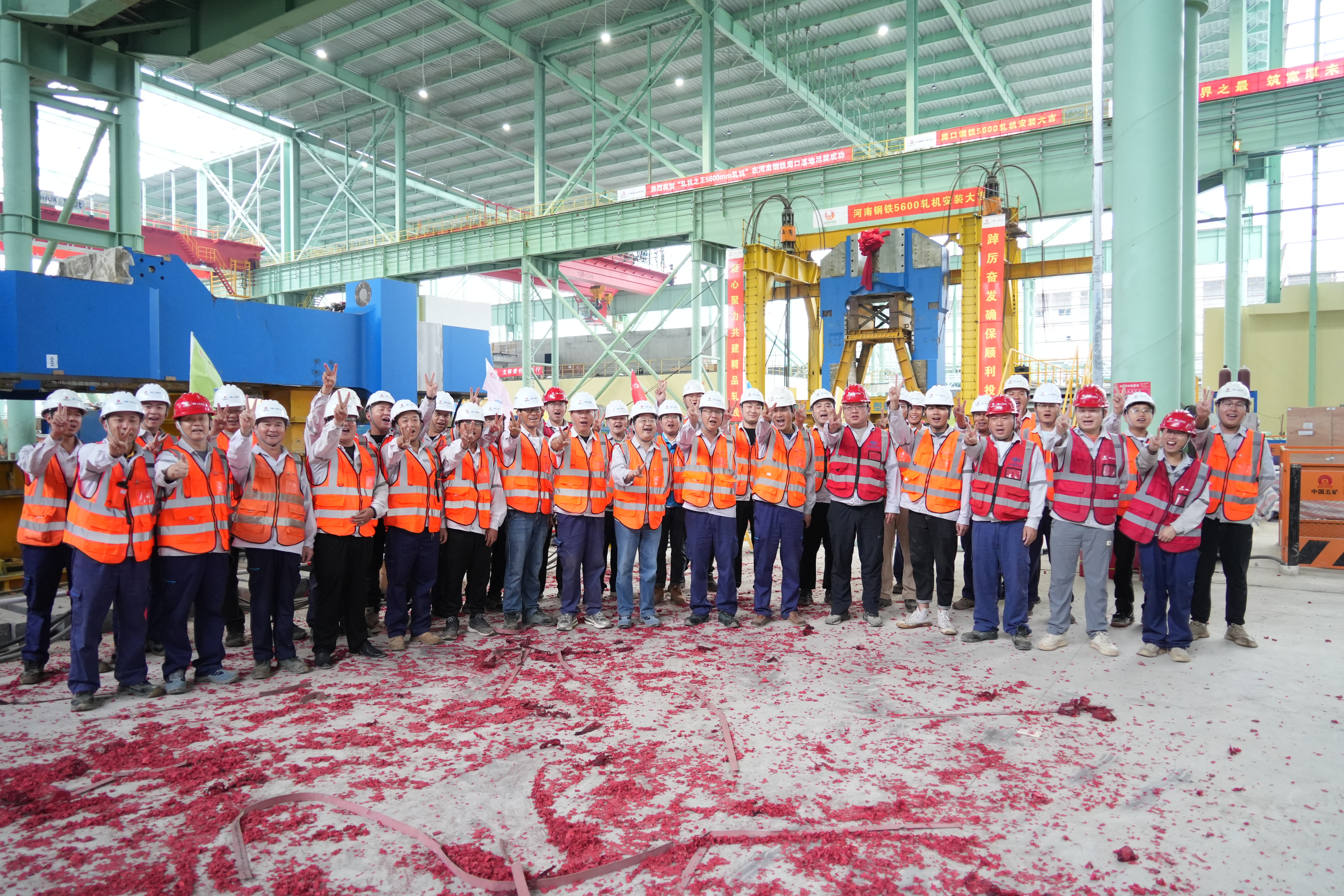 该工程粗轧机单片牌坊重量约为422.8吨,是全球最大宽幅5600毫米宽厚板粗轧轧机牌坊。由于此次安装牌坊重量远远超出主轧跨两台150吨行车的额定起重量之和,项目管理团队精心策划,采用公司多次成功应用并推广的专利“液压同步推移、旋转组合提吊工艺”代替传统双机抬吊方式进行牌坊的安装,整个过程一气呵成,完美体现了宝冶速度,为顺利实现周口钢铁宽厚板项目热负荷试车节点目标打下了坚实基础。